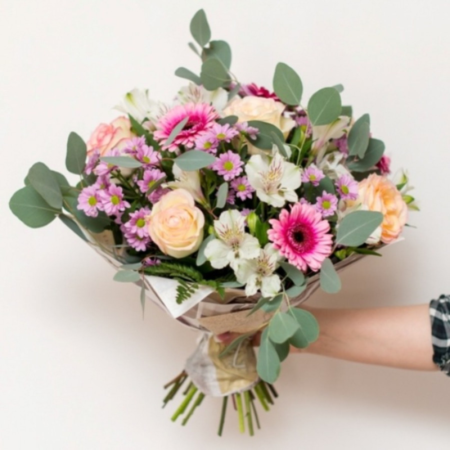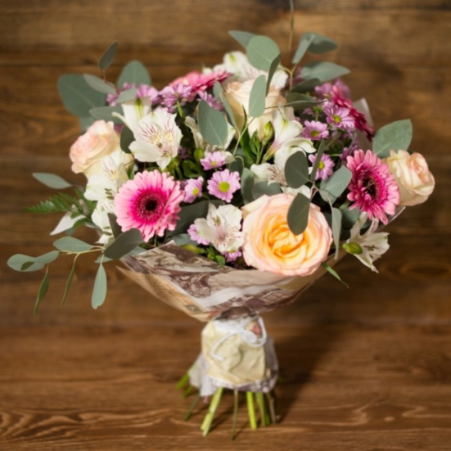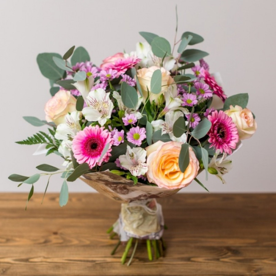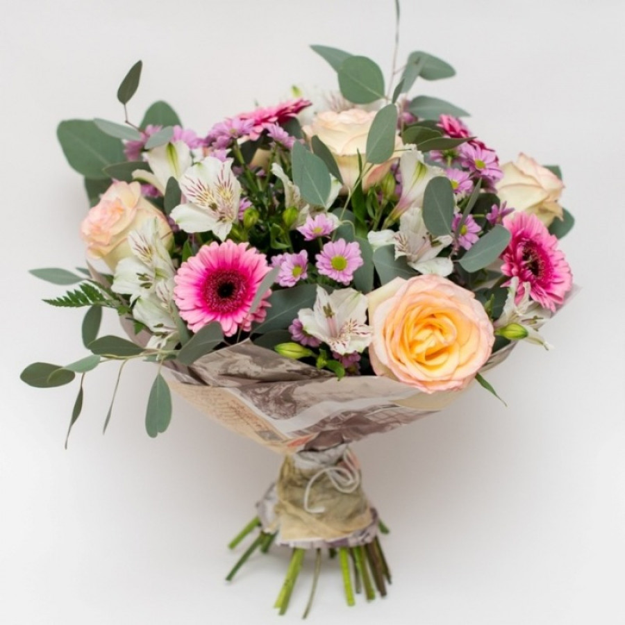 Превосходное сочетание роз, гербер, сантини, альстромерий, вечно зеленых веточек эвкалипта и папоротника создаст летнее настроение в любое время года, подарит массу позитивных ощущений, вызовет улыбку и ностальгию о теплых, романтичных летних вечерах. Оригинальное оформление букета подчеркнет Ваш безупречный вкус и сделает цветы отличным подарком на любой праздник или торжественное событие.