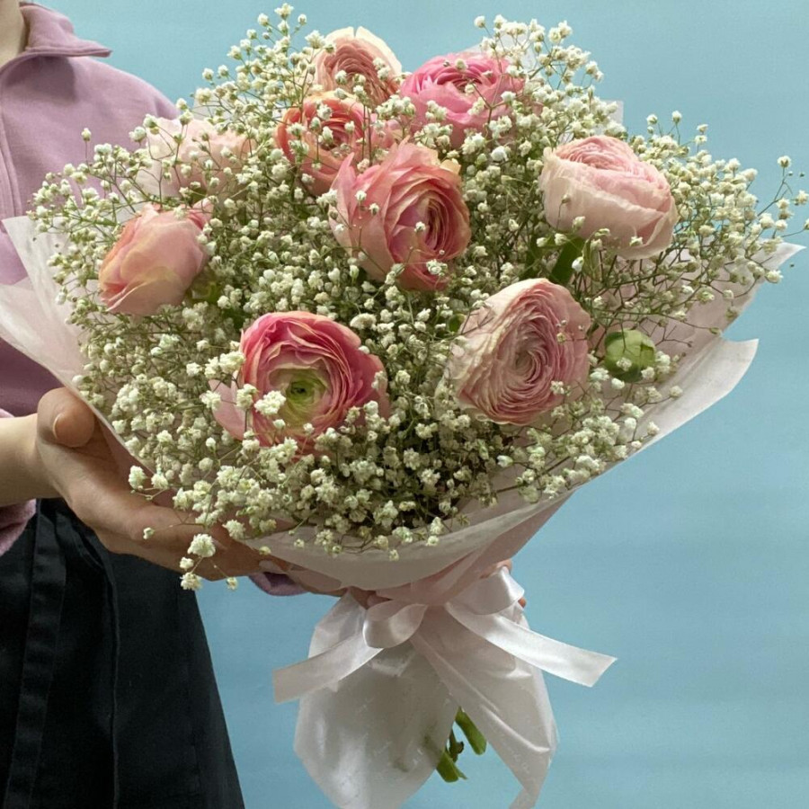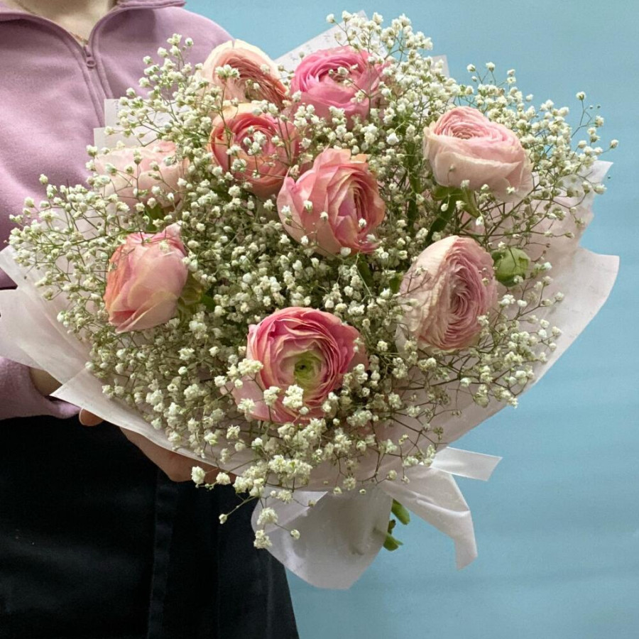Букет из розовых ранункулюсов с белой гипсофилой в Спасск-Дальнем