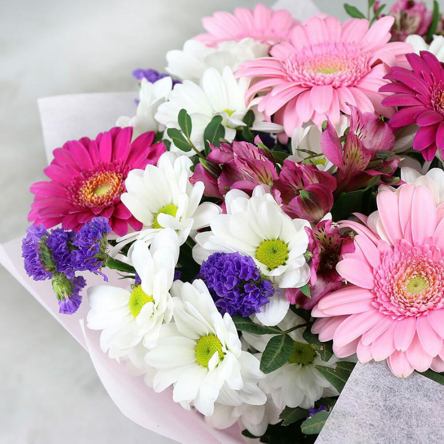 На фото букет «ягодный щербет». В составе: гербера 7 шт, альстромерия 3 шт, хризантема кустовая 4 шт, статица 2 шт, писташ 1 шт, дизайнерская упаковка 1 шт, атласная лента 1 шт, . Все цветы свежие и ароматные, букет красиво оформлен и отлично подходит для подарка. Доступна доставка цветов или самовывоз.